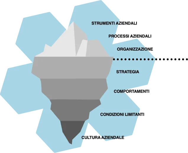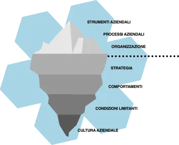 Il nostro approccio si basa sugli elementi chiave dell'azienda, partendo da quelli «nascosti» – strategia, cultura e comportamenti – per alimentare e ottimizzare quelli visibili – organizzazione, processi e strumenti.